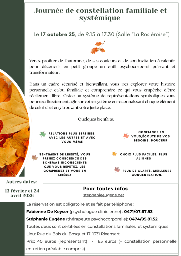 – Animatrices Fabienne De Keyser (psychologue clinicienne) et Stéphanie Eugène (toutes les deux certifiées en constellations – formatrice Caroline Boland).